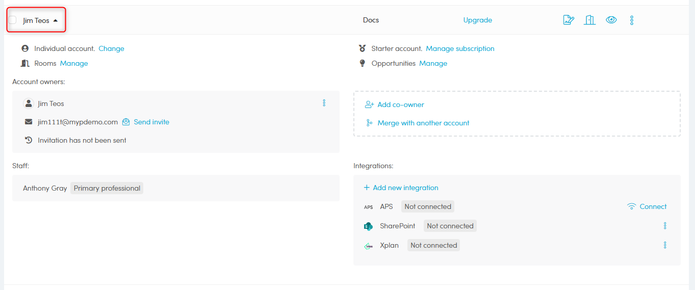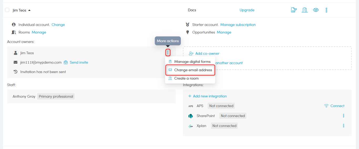 In the drop down screen, click 'More actions' from within the Account owners area, then click 'Change email address'.