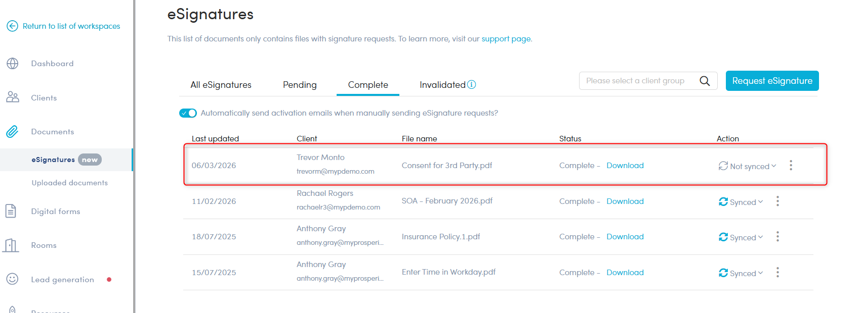 The document export feature can only be triggered via the Partner Portal either in 'Uploaded Documents', 'eSignatures' or the 'Docs' area of the Client's portal.