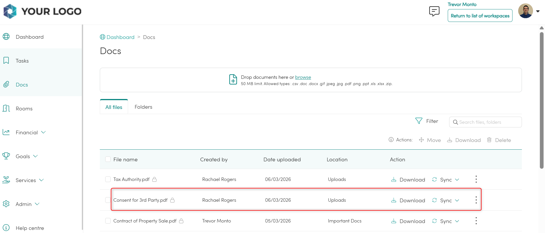 1. Locate the document you want to export from either the 'Uploaded Docs' or 'eSignatures' area of your Partner Portal, or the 'Docs' area of the Client portal.