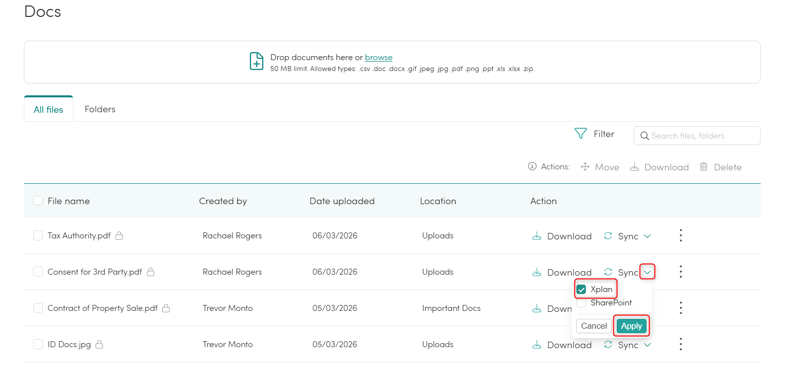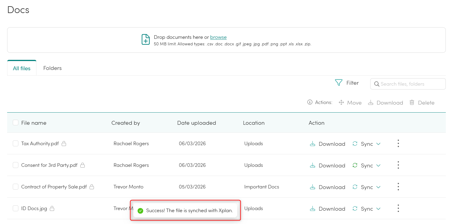 The integration with Xplan enables you to selectively export documents from the portal to Xplan on a document-by-document basis. This feature is a one way export from the portal to Xplan.